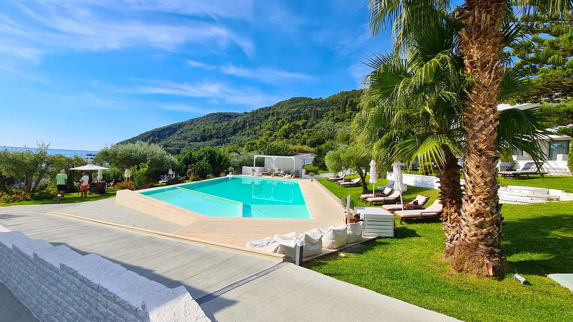 Lille oase med frodige blomster, oliven- og citrontræer. Perfekt til daseferie ved pool og strand, og ideelt for eventyr på det græske fastland. Nyligt renoveret, smuk havudsigt, privat strandområde, solterrasse.