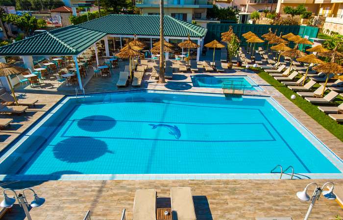Troulakis Village er et hyggeligt hotel, der er bygget op som en lille landsby, hvor små stier snor sig imellem de lavtliggende bygninger, tilbagetrukket fra den livlige hovedgade i Platanias. Hotellet byder på et rigtig fint poolområde med liggestole og parasoller, dejlig restaurant og bar samt fællesområder med plads til afslapning i bløde sofaer med udsigt til den omkringliggende natur og havet
